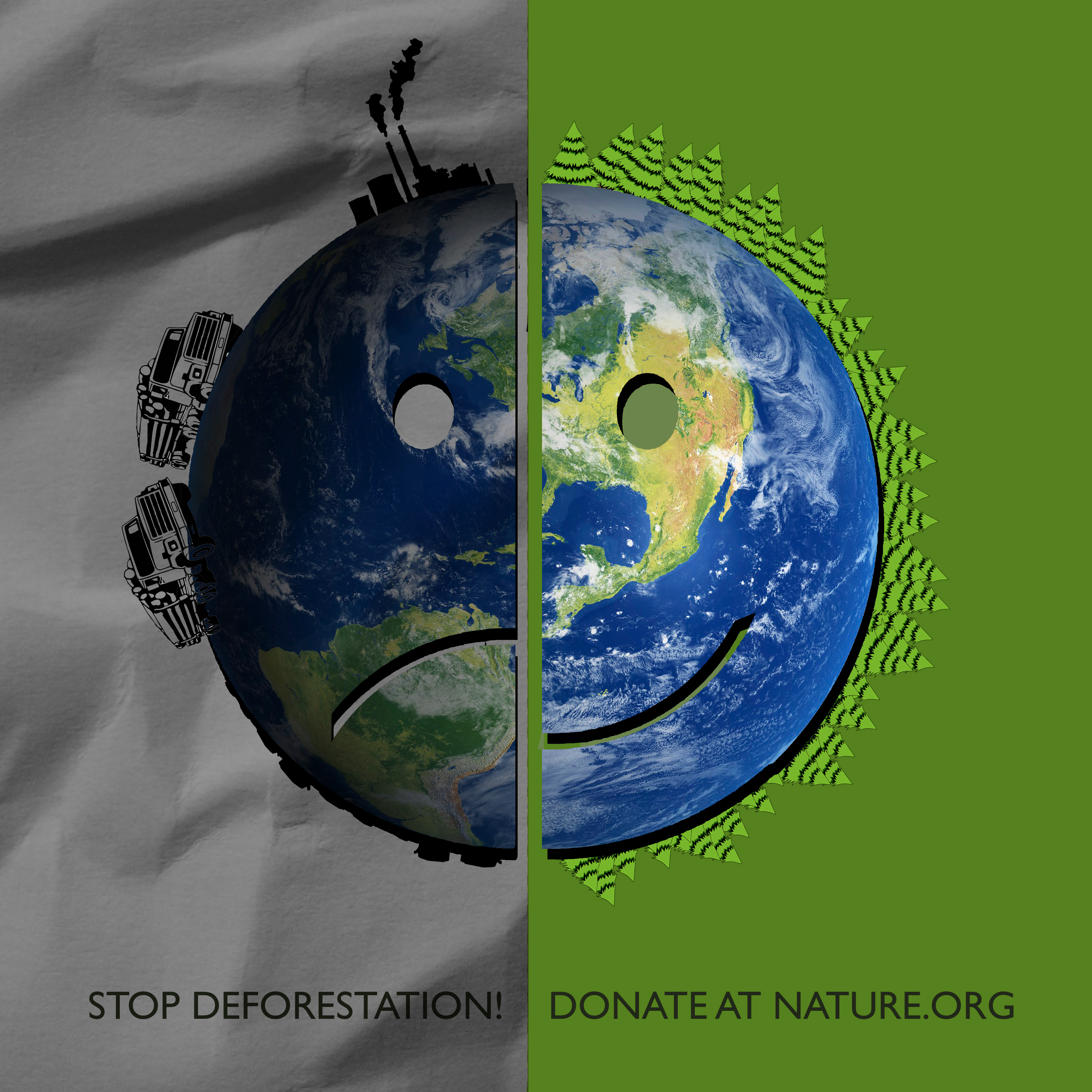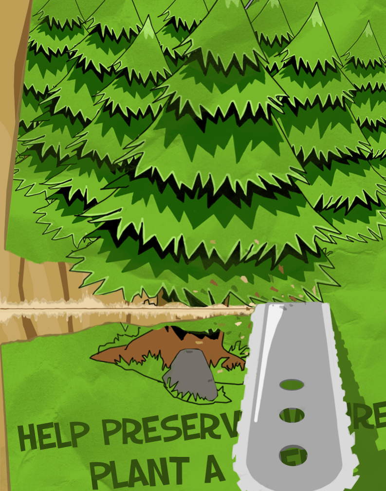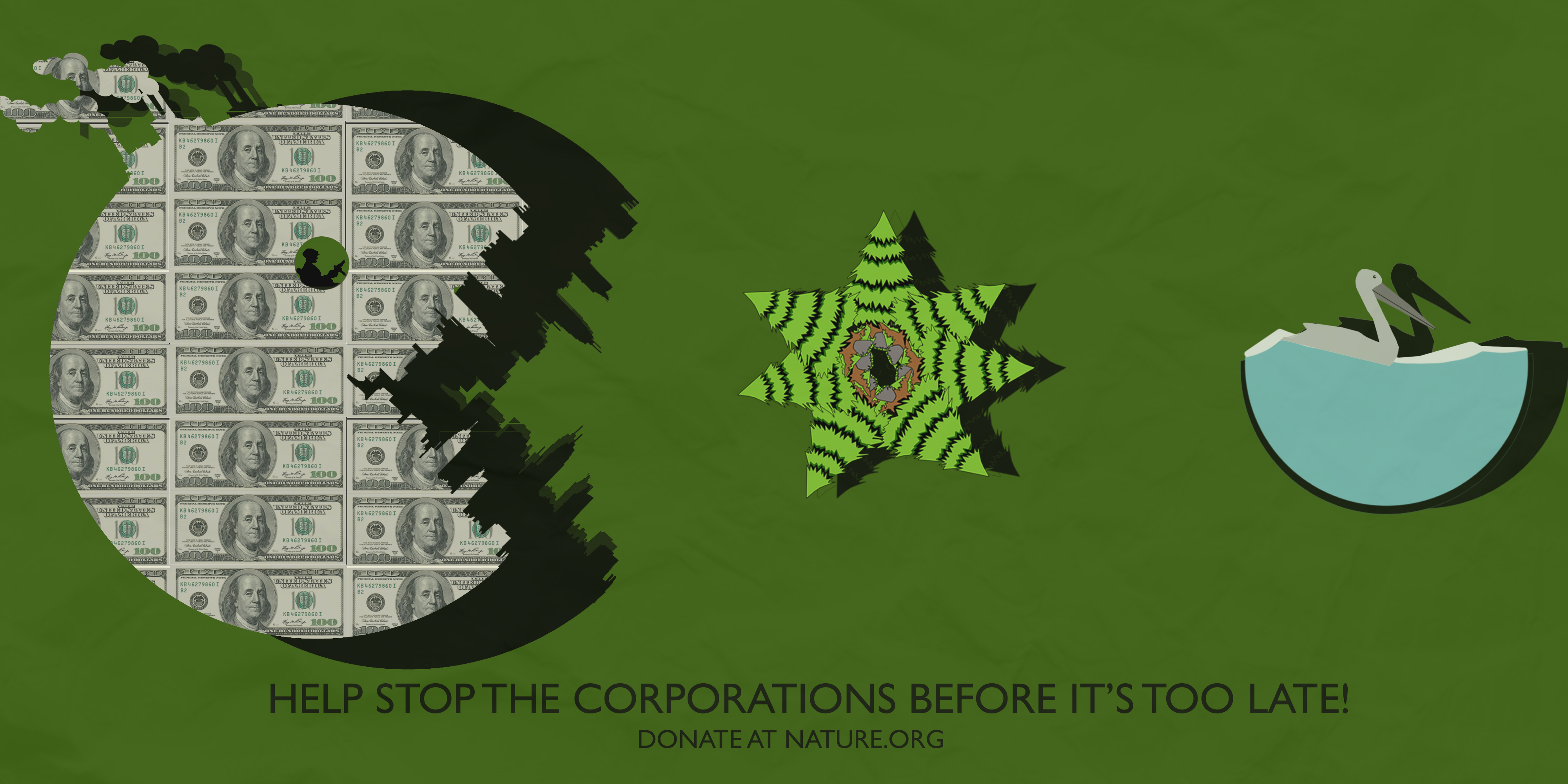 The pieces that I made covered a wide array of topic including deforestation, smoke pollution, oil spill, and animal poaching. I wanted to make each piece unique from one another, like how one piece have a PacMan reference, another is black/white and one has a non-illustrated hand on it. All of the pieces in the gallery where drawn or compose in Photoshop.