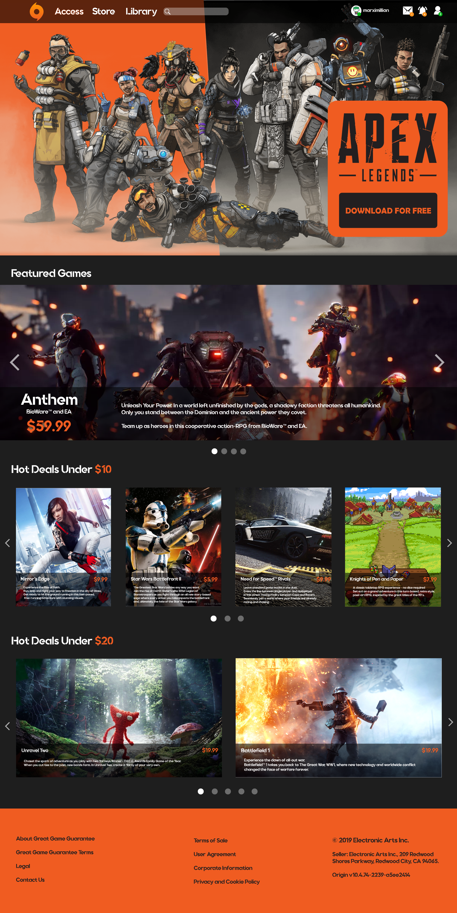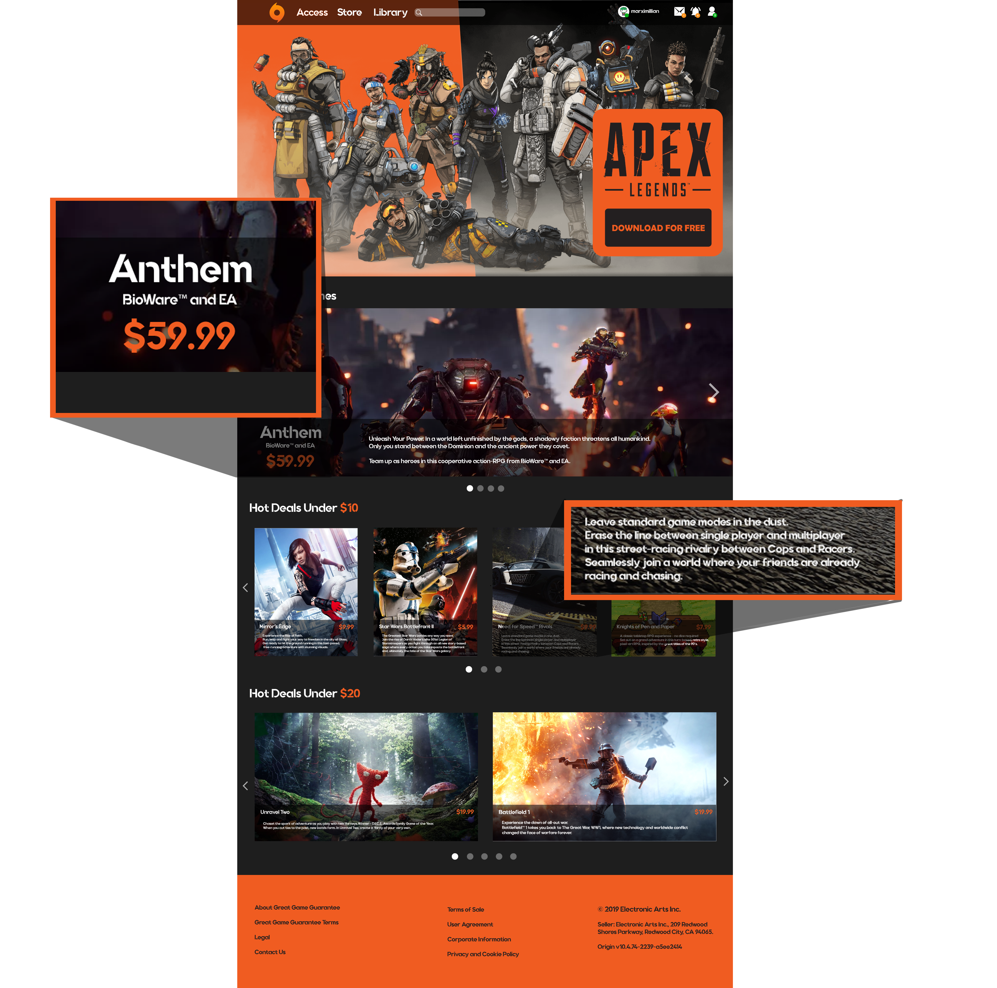 For the landing page, I wanted to showcase the biggest game of Origin front and center. I also wanted to get rid of the permanent sidebar that the client have. I feel like this is unneccessary and can easily be implented in the menu.