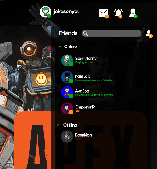 For my design, I added a drop down panel on the menu, for easy access to user. I also highlighted their current status, whether they are idle or playing a game with a mutual friend.
